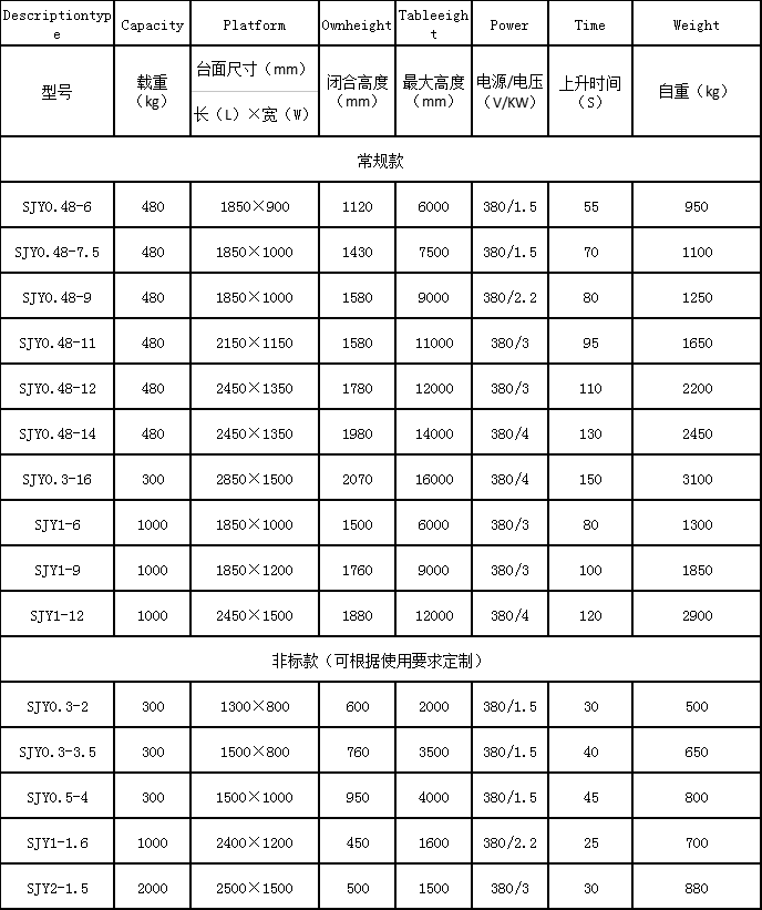 其他特殊规格可以根据客户要求制作。如外加手动泵,电瓶升降,220V电源升降,伸缩小平台等。
