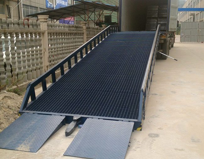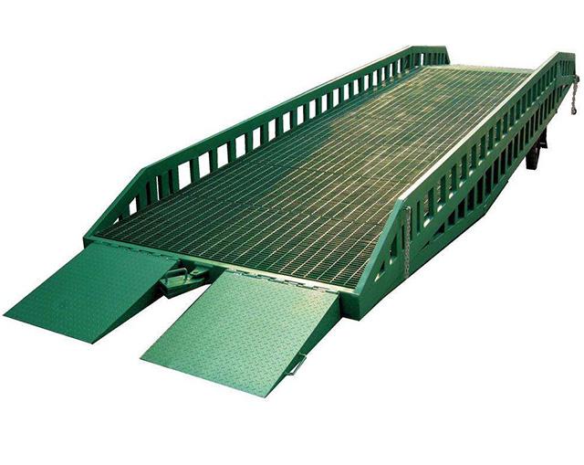移动式液压登车桥:移动式登车桥台面采用特制的波形栅格有可行的强度,能保证长期使用而不变形,它的波形栅格网状结构,充分保证了防滑性能,使叉车有更好的爬坡性和可操纵性,即使在雨、雪天气,仍能保证正常使用;登车桥置于尾部进行装卸时,当叉车装载重物行驶至车尾部,可能会使车辆发生倾覆,通能机械为每位用户随机提供了可调式安全支撑座,用于装卸作业时(特别是轻型货车或空载货车装卸作业时)防止车辆倾覆,从而保证作业安全,它的支撑高度可以随车辆高度调节,能满足多种车辆的使用性;可调节长度的索链可方便地钩住货车,使登车桥与货车始终紧密贴合;采用手摇液压泵作动力,勿须外接动力电源即可轻松实现登车的高度调节;配置的刹车垫可有效防止货车装卸时登车桥移位。