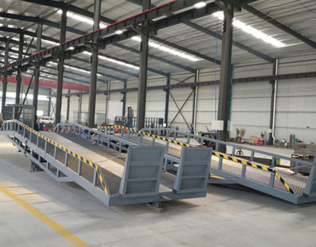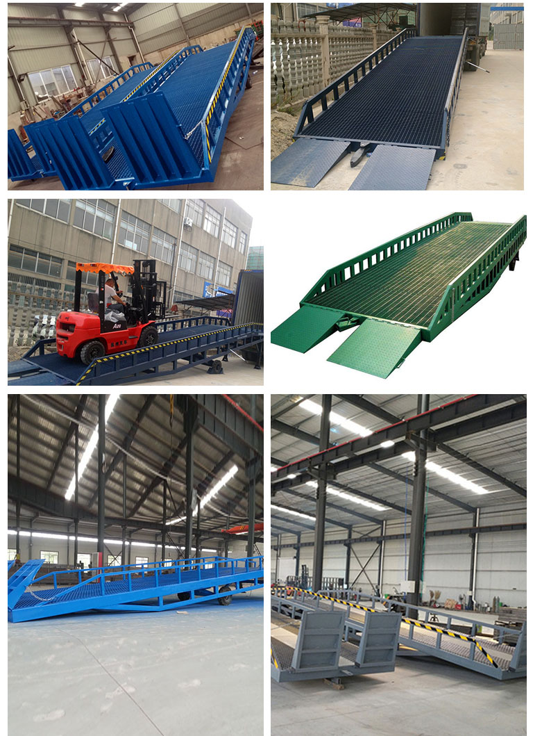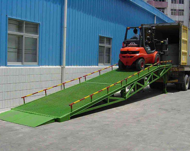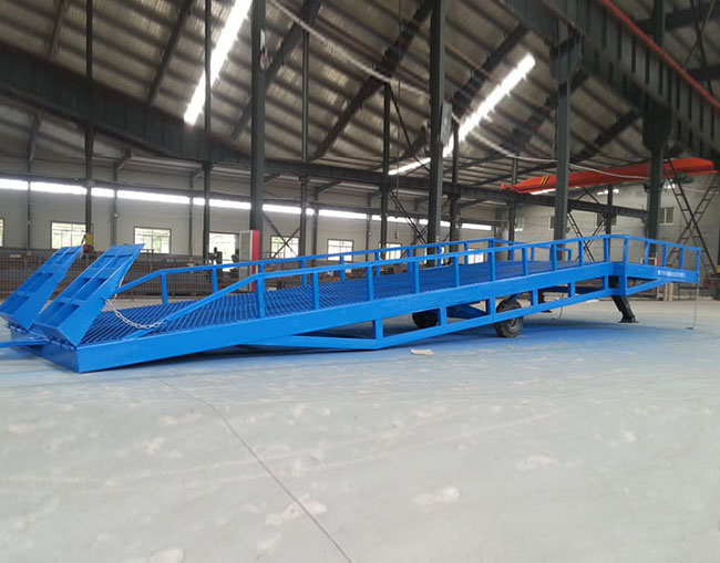 移动式登车桥是与叉车配合使用的货物装卸辅助设备,可根据汽车车厢的高低调节高度,叉车可以直接通过本设备驶入车厢内部进行货物的批量装卸,仅需单人作业,即可实现货物的快速装卸。主要适用于各类工厂、仓库、堆场、车站、码头、粮库等大批量装卸货需求的场所。